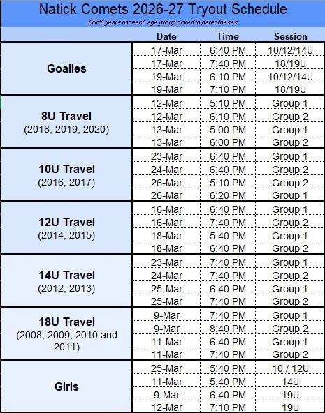 * If your player is unable to attend any tryouts due to illness or injury please reach out to registrar@natickcomets.com
